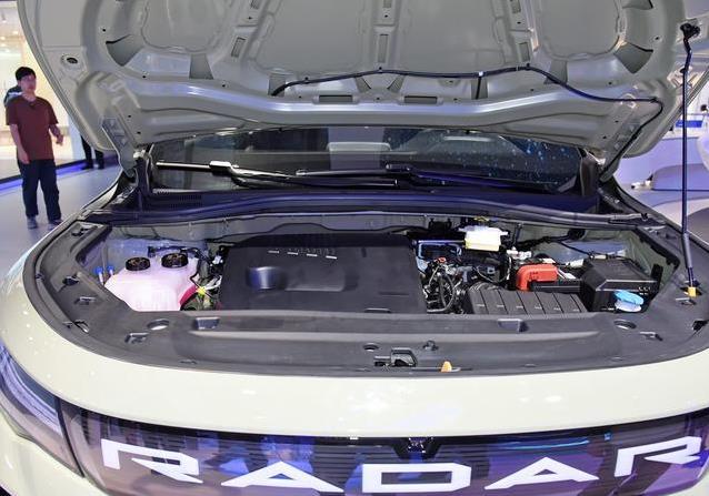新车的外观没啥大变化,依然是那股硬汉味儿。车头用封闭式格栅,黑色饰板上印着“RADAR”字样,跟熏黑大灯连成一片,看着挺有气势。前舱盖上几条隆起的线条,显得车头很有力量感。