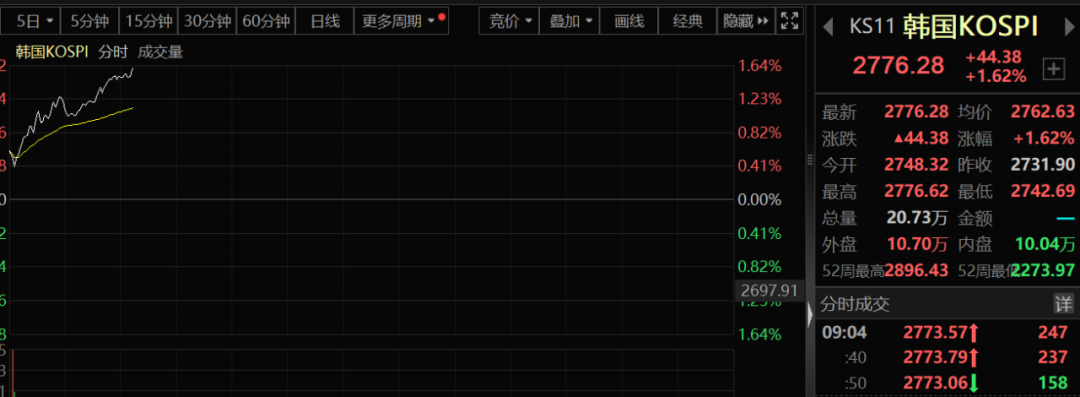 韩国市场也明显拉升,KOSPI指数狂拉超1.6%。